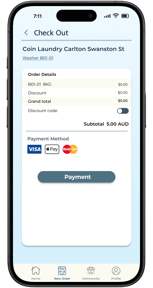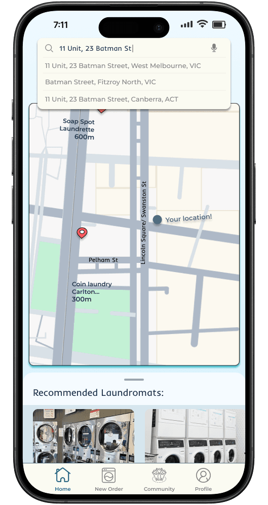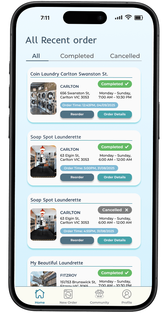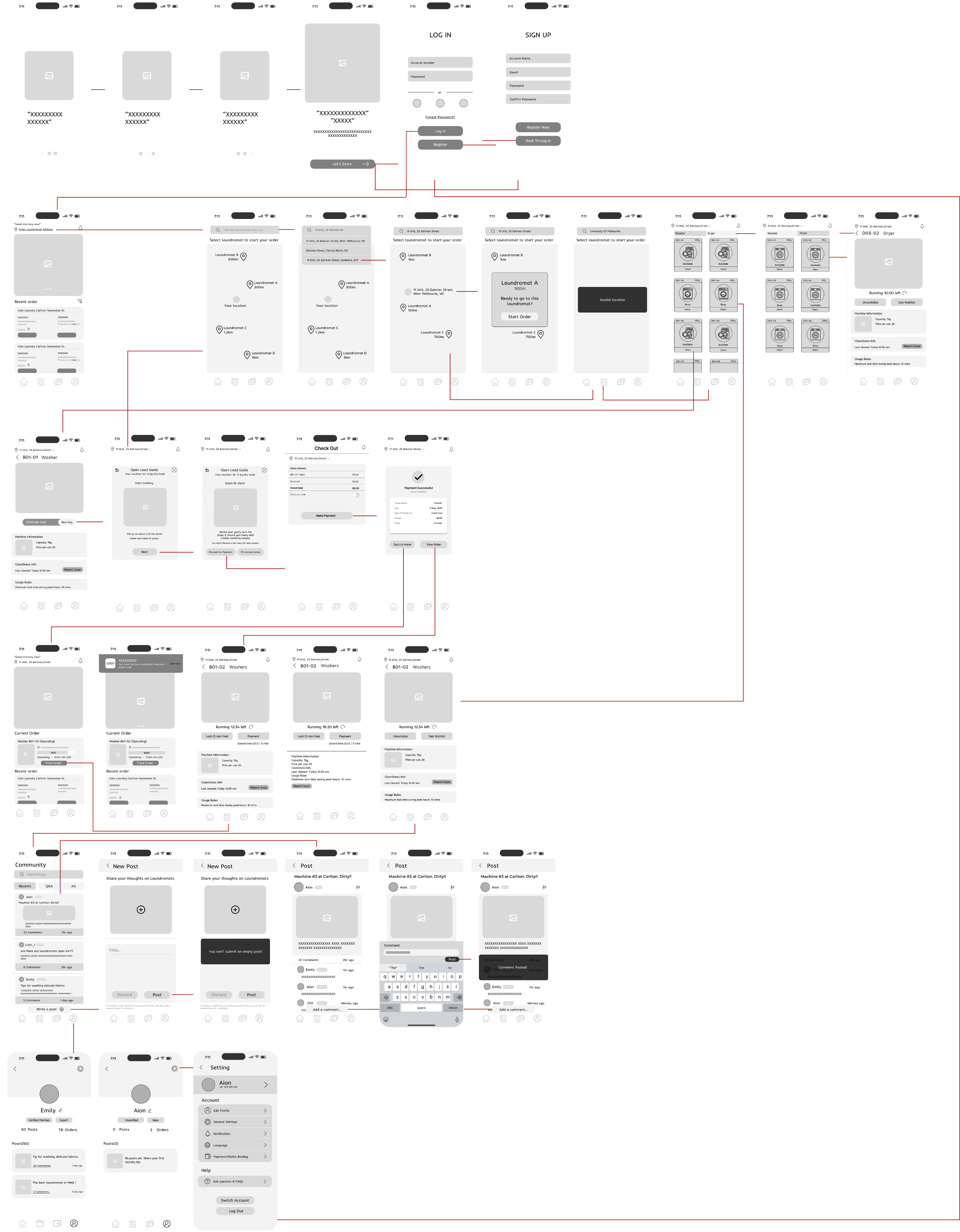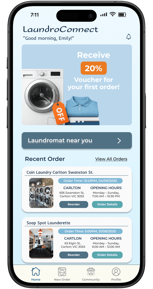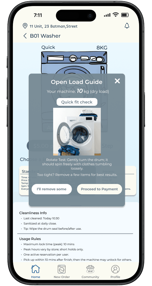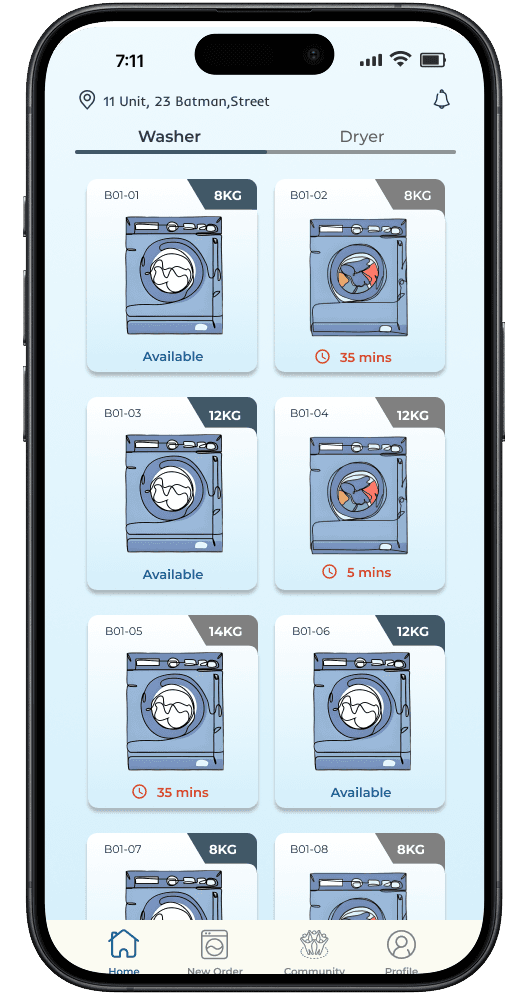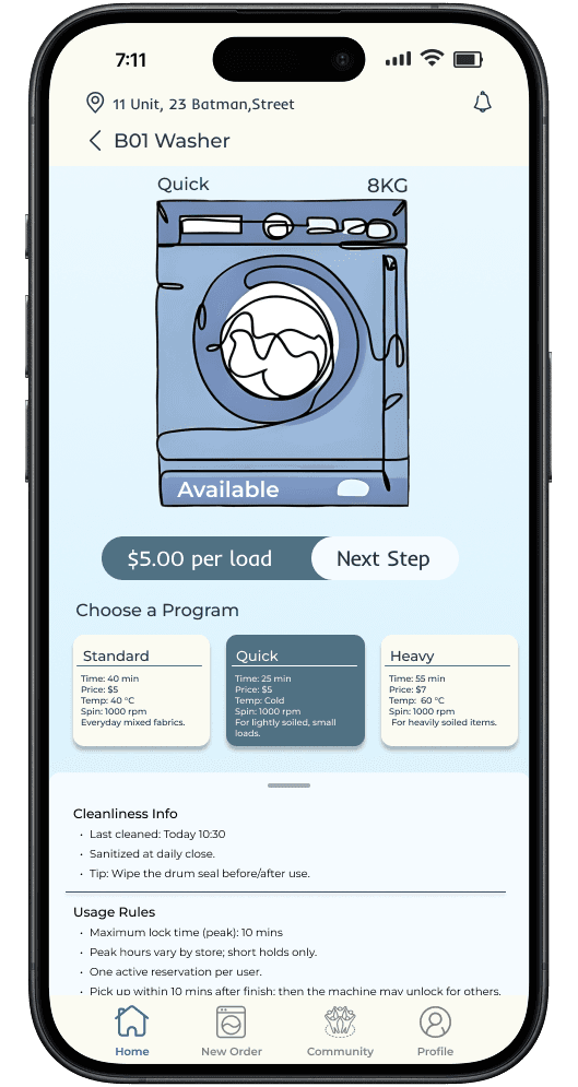 In the final prototype, we integrated these design directions into a coherent end-to-end flow: map browsing → machine selection → order tracking → pickup extension → community feedback. The system helps users quickly understand their current status and next possible actions, transforming laundry from a passive waiting task into a more predictable and controllable everyday routine.