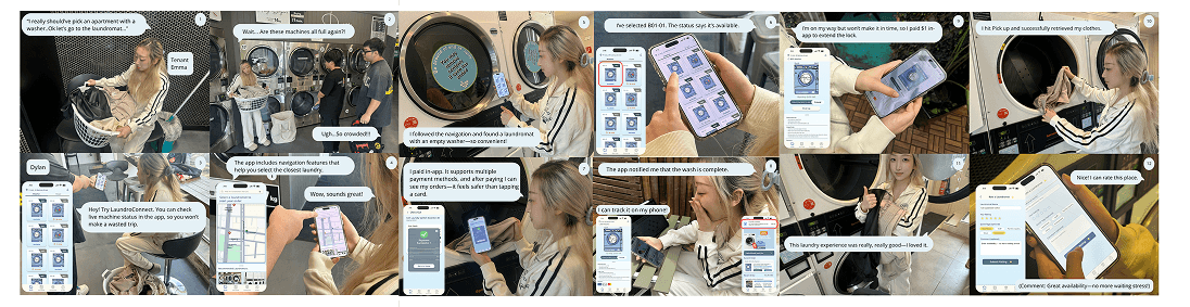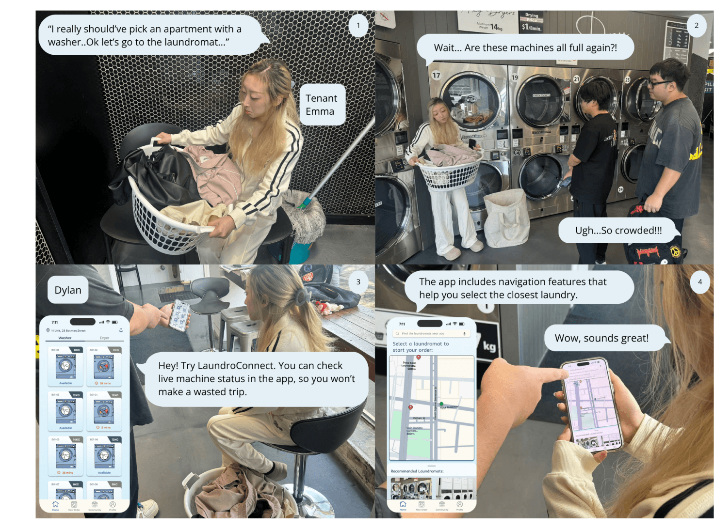 Based on our research, we identified three recurring pain points in the public laundromat experience: lack of visibility of machine availability, unclear hygiene conditions, and the absence of effective remote communication mechanisms. These issues often lead to wasted trips, waiting anxiety, and conflicts between users, and they became the starting point for our ideation process.