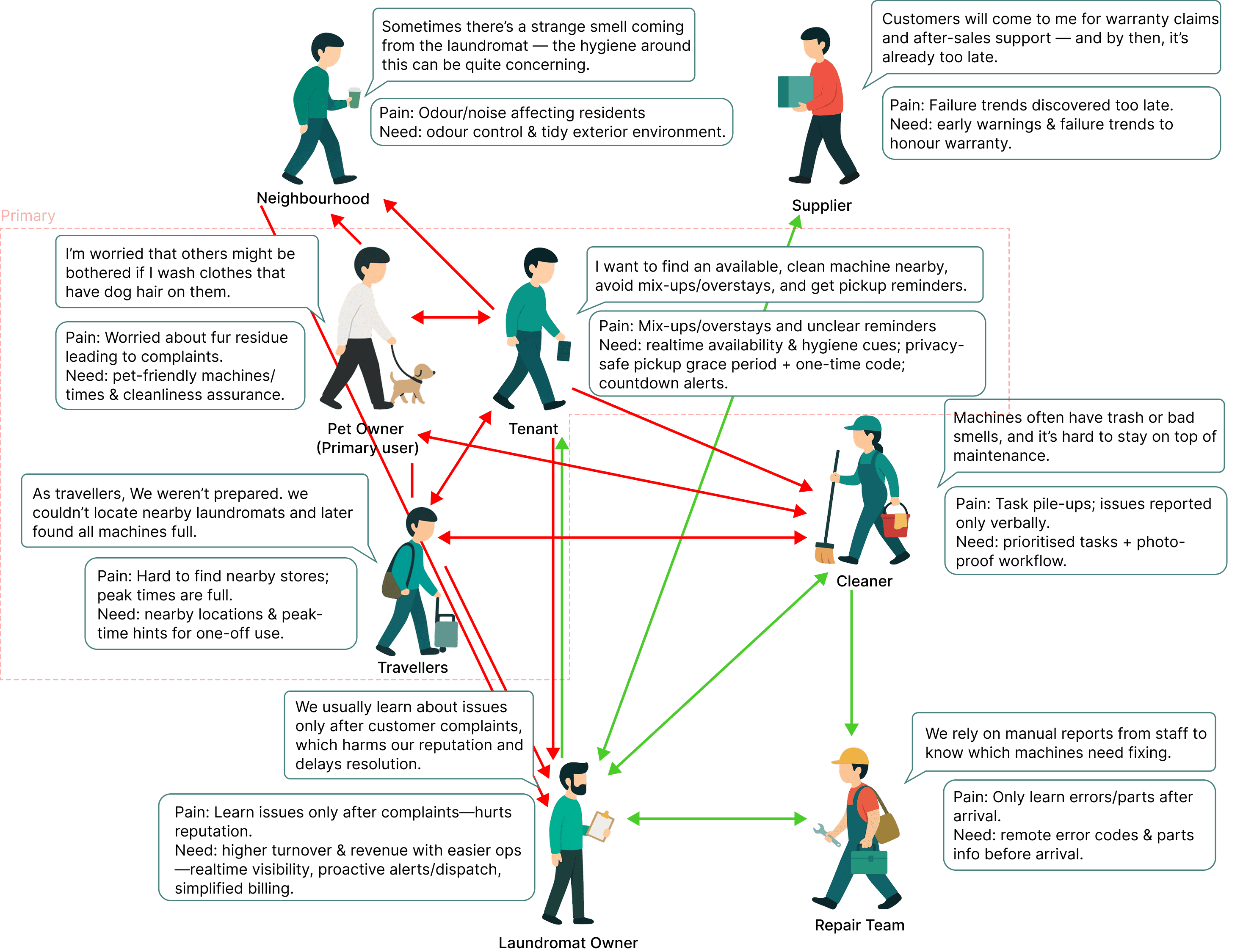 This stakeholder map showing how tenants, travelers, pet owners, cleaners, owners, and maintenance staff operate within the same shared space while holding distinct — and sometimes conflicting — needs, priorities, and responsibilities.