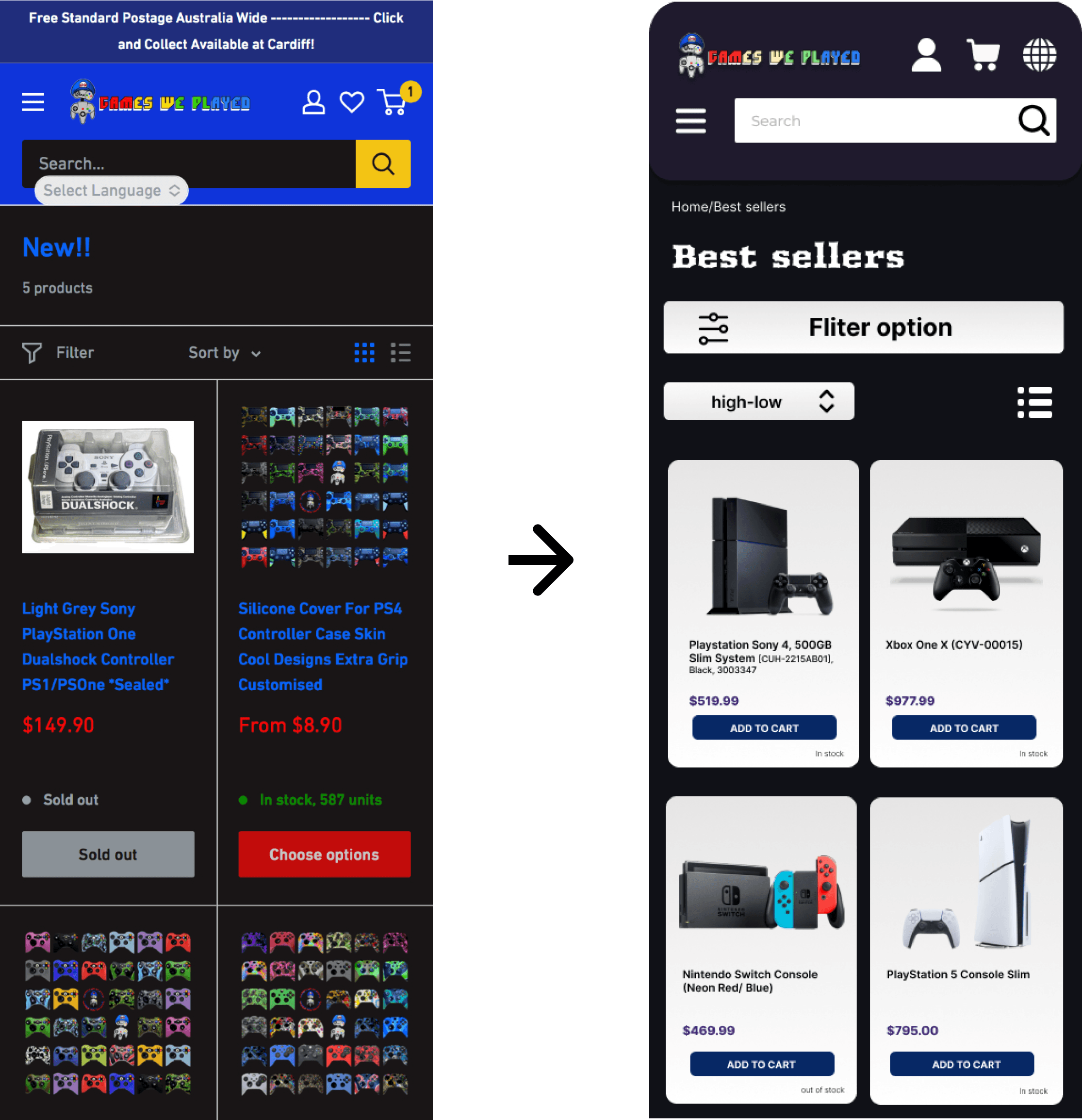 Games We Played is a responsive UI redesign project for a retro gaming e-commerce platform. The project focuses on improving product discovery, visual hierarchy, and the overall purchase experience across desktop and mobile devices.