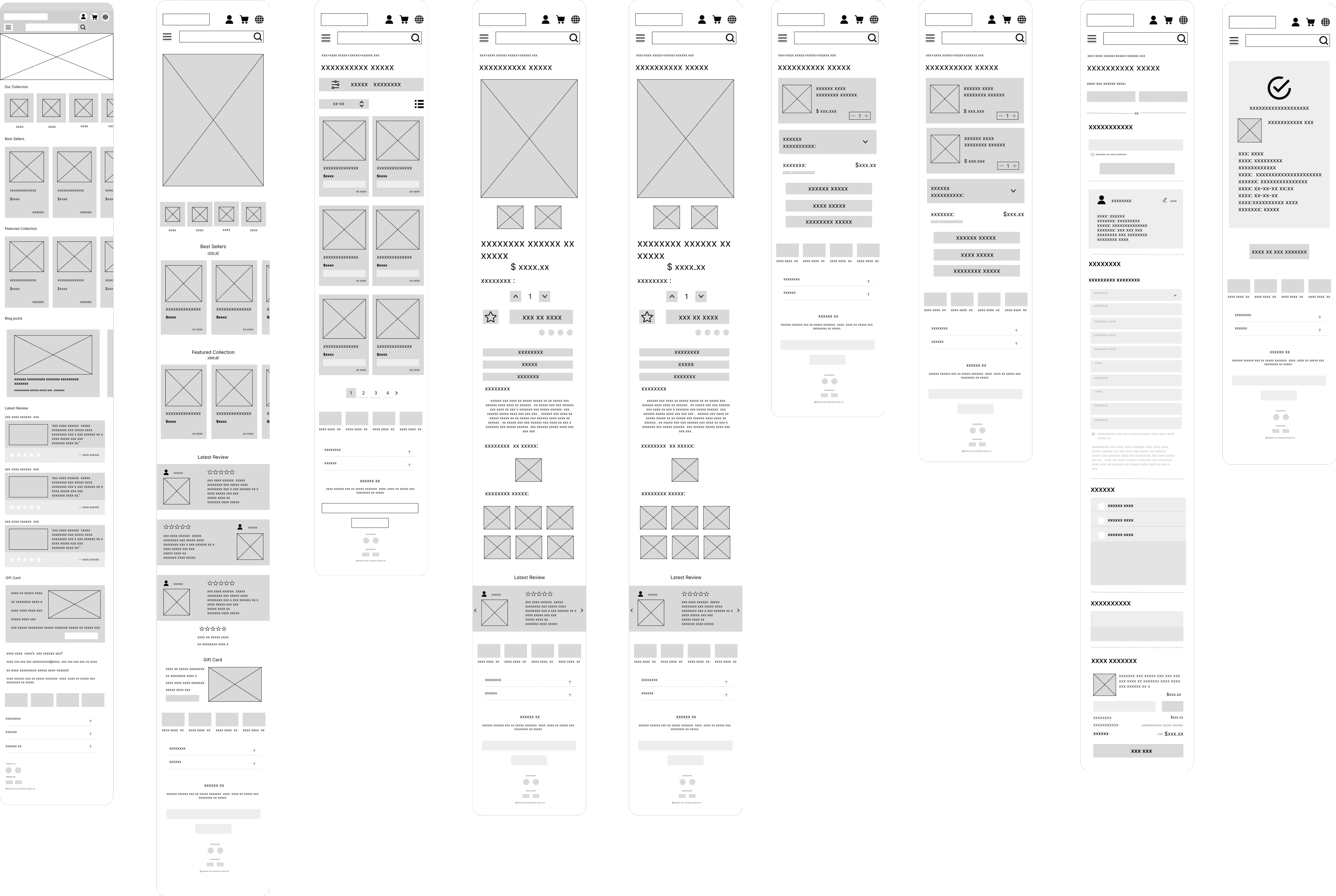 Responsive high-fidelity UI designs across desktop and mobile platforms, covering the core e-commerce purchase flow.